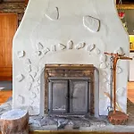 Naast een stenen open haard heeft deze accommodatie ook een TV. Deze gesitueerde in Veskoniemi Holiday Home Nanguvilla By Interhome beschikt over een badkamer met een apart toilet, een badkuip en een douche.